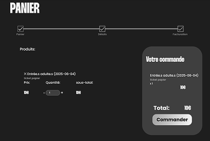 Grâce à JavaScript, les choix étaient mémorisés temporairement, simulant une vraie expérience d’achat. J’ai également intégré des ajustements dynamiques sur mobile, comme l’ajout de boutons pour gérer facilement le nombre de billets.